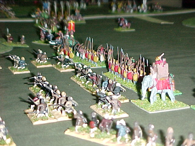 Meanwhile my Indian ally consisting of Bow(X) and 2 elephants, marched up on the left flank to meet the Picts ally. On this picture you see in the distance how my Pikecommand had advanced too, but the gap between the two was dangerously big. Both of my ally's flanks are each covered by one superior elephant, which my opponent tried to attack in the flank with some auxilia.