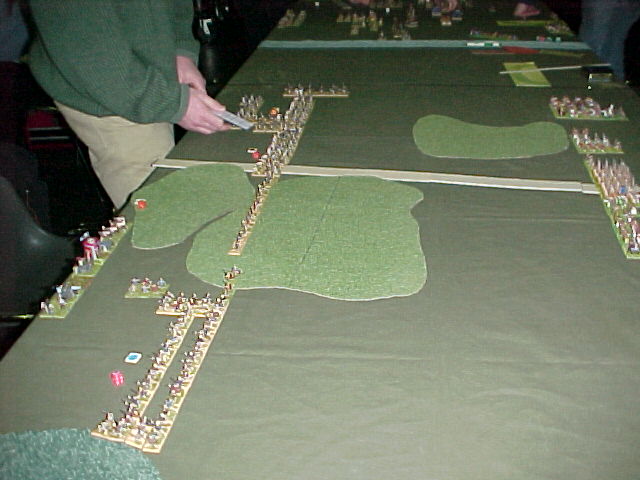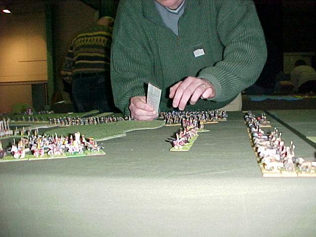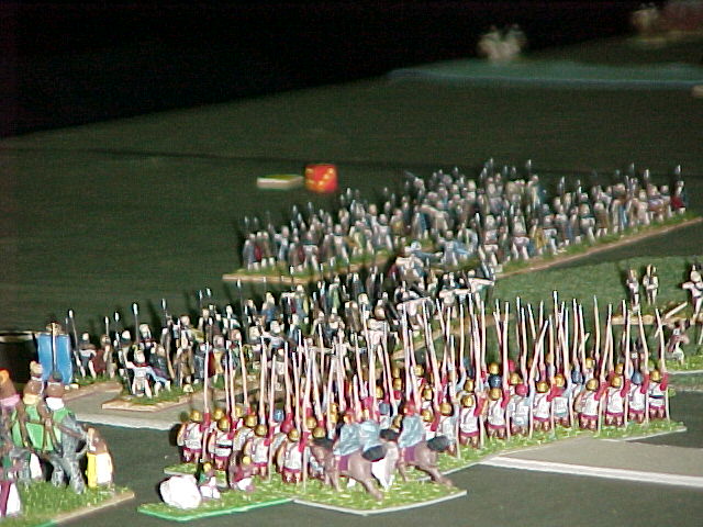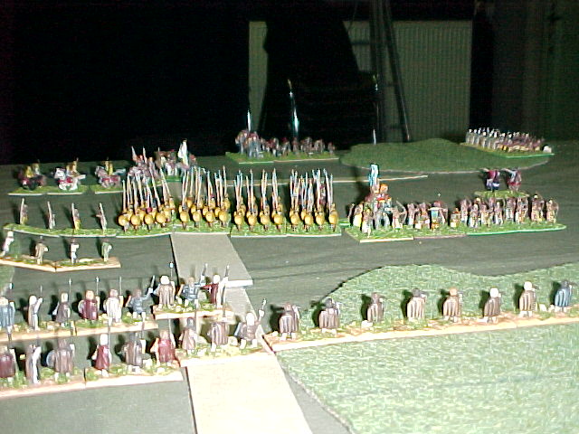 They kept closing in but some pesky psiloi managed to hold them up for a long time. Too long, time was called and they didn't make it. My right flank held out, so the result was a draw, me demoralising one of his commands, while mine remained in good shape.