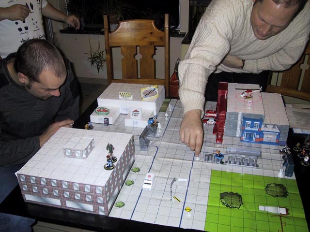 Phil is moving a figure while Wim is looking on.