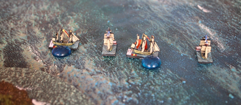 Grumble. Luckily, however, what little damage and delay my ships could do to the French ships was enough to enable the Bahama to escape in the nick of time. Victory to the Spanish! Truth be told, it’s probably the turn or so the French spent getting underway again after they failed to tack in the beginning of the game that saved me :).